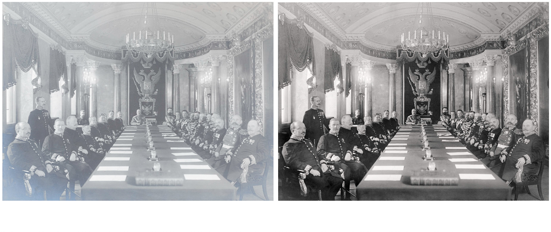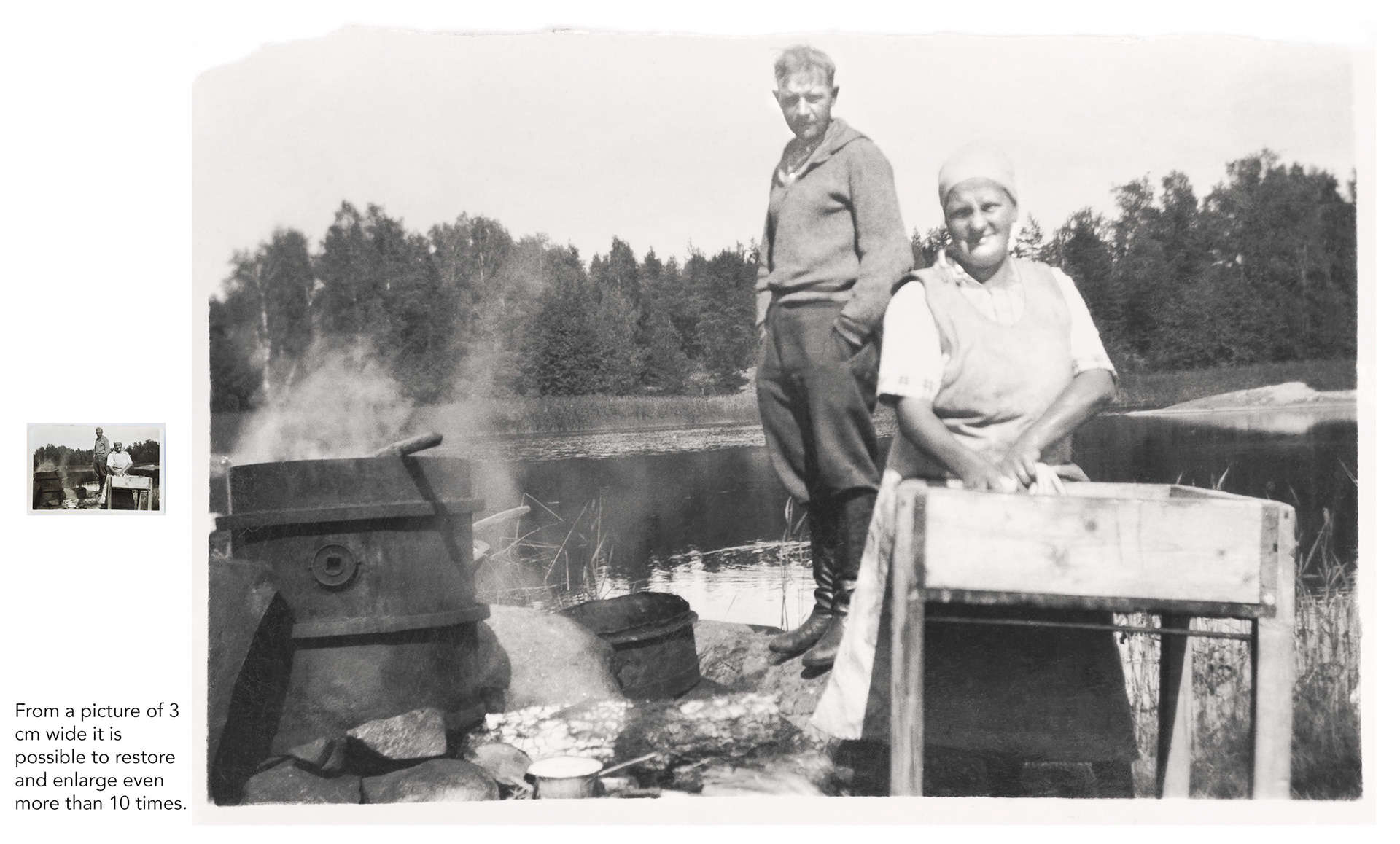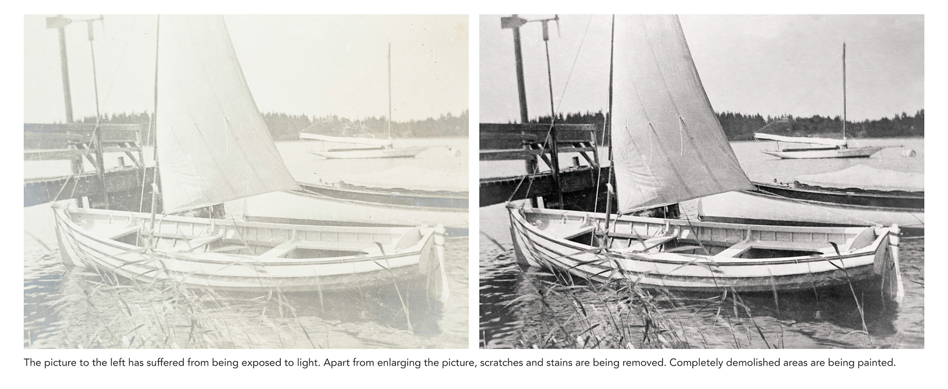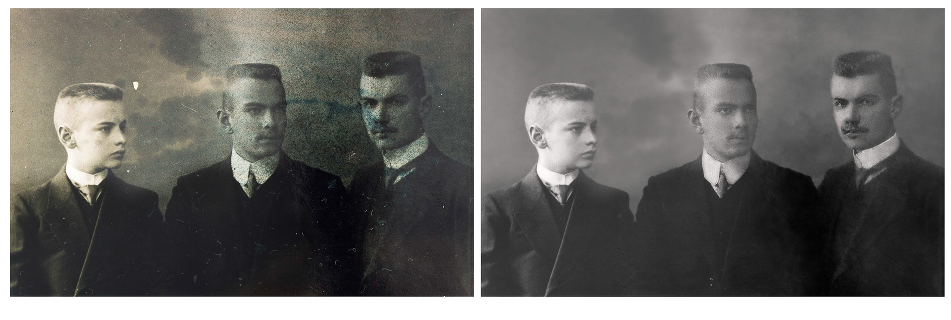 It is possible to make old photographies look as if taken with modern equipment, but usually the old feel of the picture is kept. In the pictures below the yellowing from ageing has been minimized.